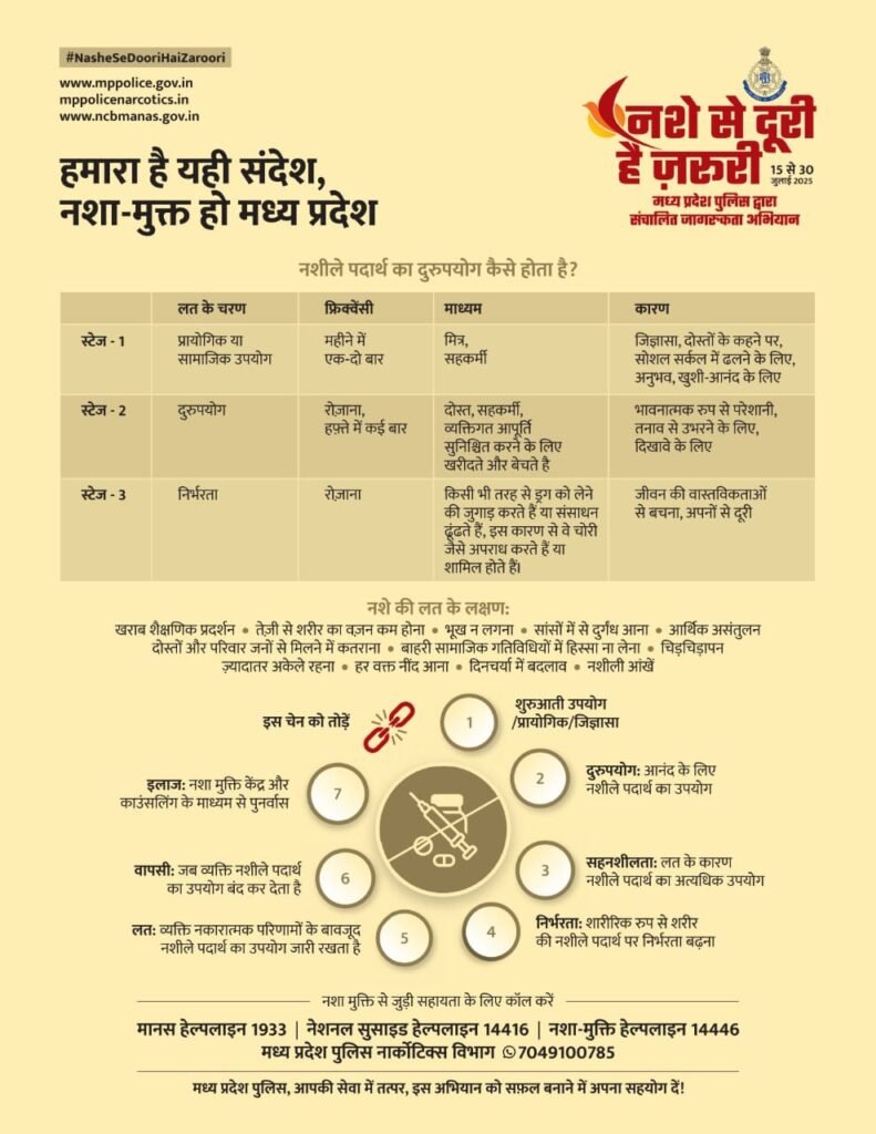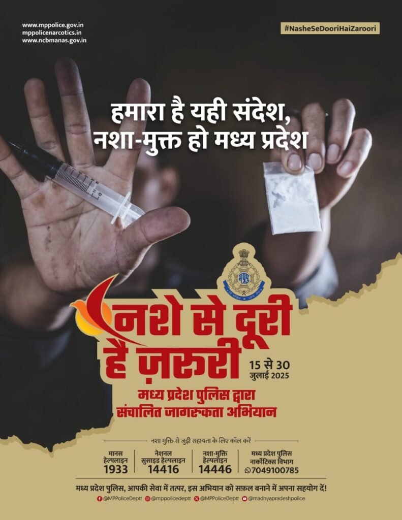 जनमत भास्कर छिंदवाड़ा:-मध्यप्रदेश सरकार द्वारा प्रदेश में नशीले पदार्थों के बढ़ते उपयोग और उसके दुष्परिणामों के प्रति समाज को जागरूक करने हेतु “नशे से दूरी है जरूरी” जन-जागरूकता अभियान का आयोजन कल 15 जुलाई से 30 जुलाई तक किया जा रहा है।
