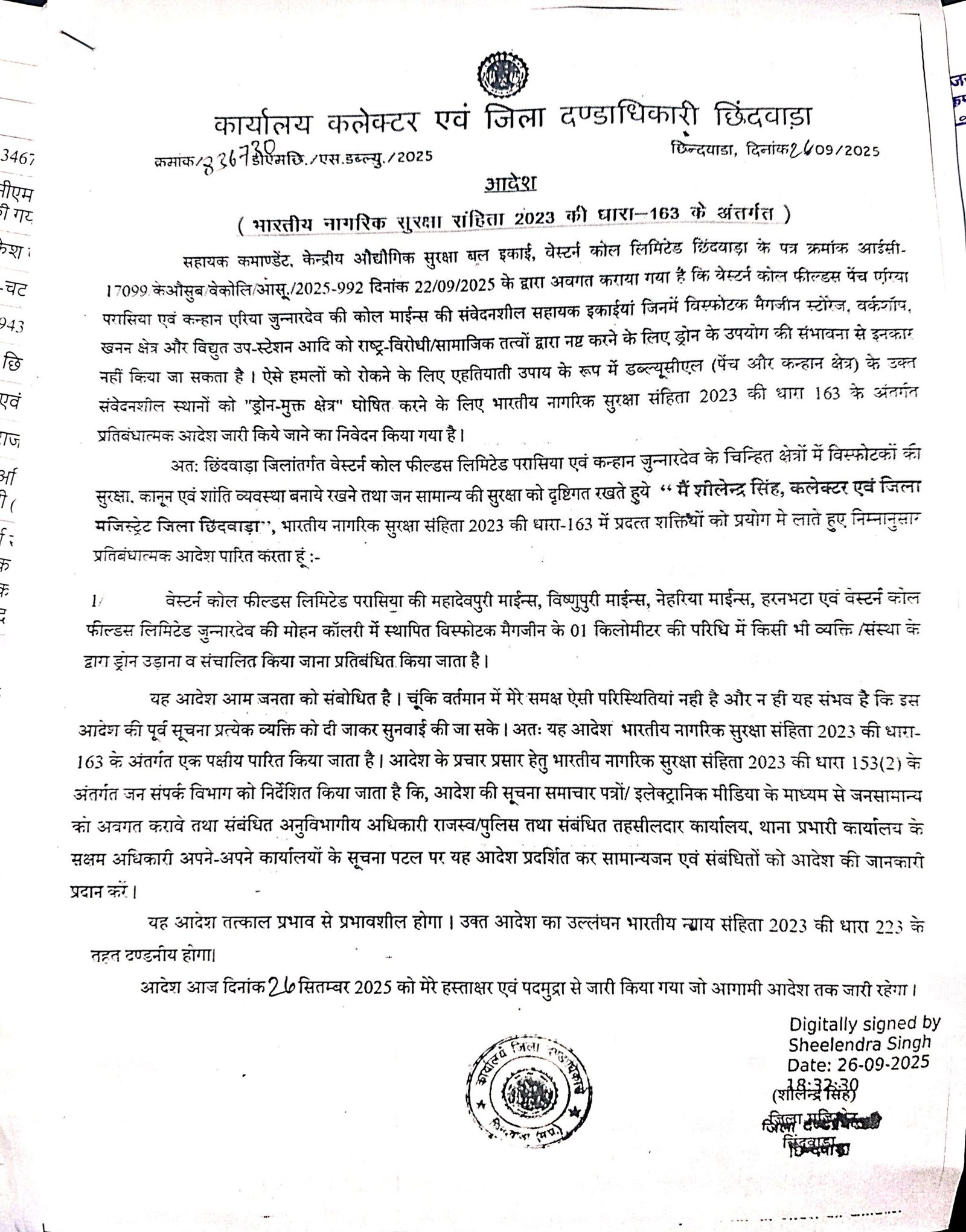 भारतीय नागरिक सुरक्षा संहिता 2023 की धारा 163 के अंतर्गत जारी इस आदेश में कहा गया है कि वेस्टर्न कोल फील्ड्स लिमिटेड परासिया क्षेत्र की महादेवपुरी,विष्णुपुरी, नेहरिया,हरनभटा खदानों एवं जुन्नारदेव क्षेत्र की मोहन कॉलरी में स्थापित विस्फोटक मैगजीन के एक किलोमीटर परिधि क्षेत्र में किसी भी व्यक्ति अथवा संस्था द्वारा ड्रोन उड़ाना एवं संचालित करना प्रतिबंधित रहेगा।