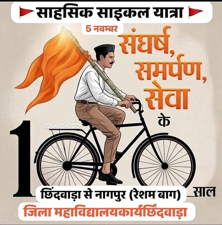 जनमत भास्कर छिन्दवाड़ा:-राष्ट्रीय स्वयंसेवक संघ के 100 वर्ष पूर्ण होने के उपलक्ष्य में राष्ट्रीय स्वयंसेवक संघ छिंदवाड़ा महाविद्यालय कार्यविभाग द्वारा एक भव्य एवं साहसिक साइकिल यात्रा का आयोजन किया जा रहा है। यह यात्रा छिंदवाड़ा से नागपुर तक निकाली जाएगी,जिसमें जिले के महाविद्यालयीन विद्यार्थी एवं संघ के स्वयंसेवक उत्साहपूर्वक भाग लेंगे।