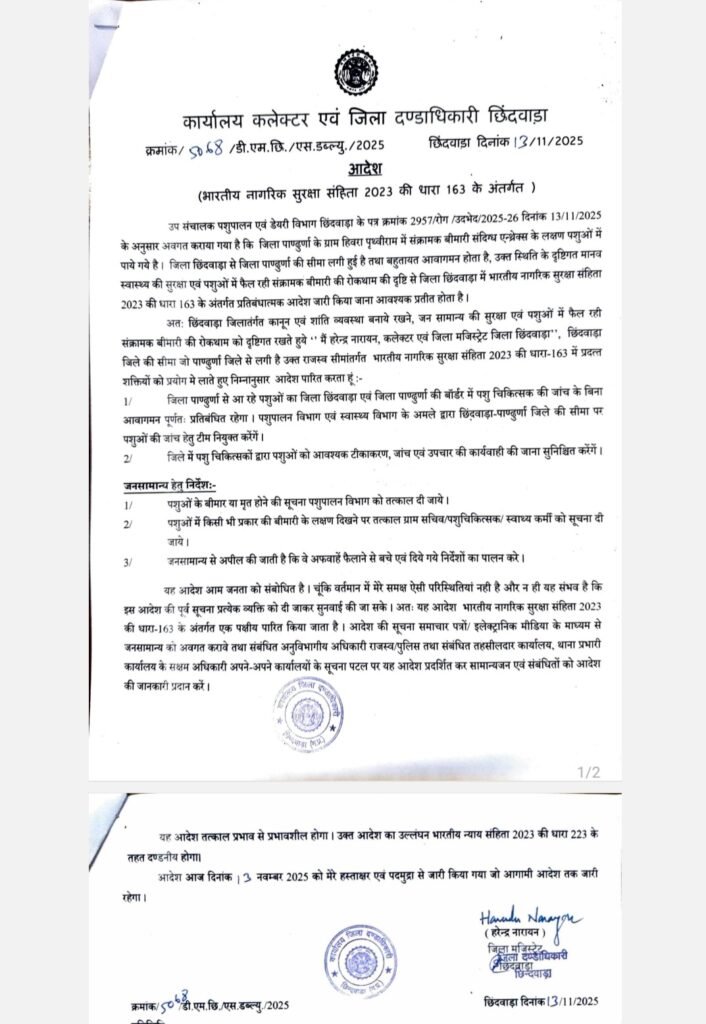 जनमत भास्कर छिन्दवाड़ा:-जिले के सीमावर्ती क्षेत्र में पशुओं में संक्रामक बीमारी के संदिग्ध लक्षण पाए जाने के बाद कलेक्टर एवं जिला दण्डाधिकारी हरेन्द्र नारायन ने भारतीय नागरिक सुरक्षा संहिता 2023 की धारा 163 के तहत प्रतिबंधात्मक आदेश जारी किया है।पांढुर्णा जिले के ग्राम हिवरा पृथ्वीराम में एन्थ्रेक्स जैसे संक्रामक रोग के लक्षण पाए गए हैं।चूंकि छिंदवाड़ा जिला,पांढुर्णा की सीमा से सटा हुआ है और दोनों जिलों के बीच पशुओं का आवागमन होता है,ऐसे में संक्रमण की रोकथाम के लिए यह आदेश जारी किया गया है