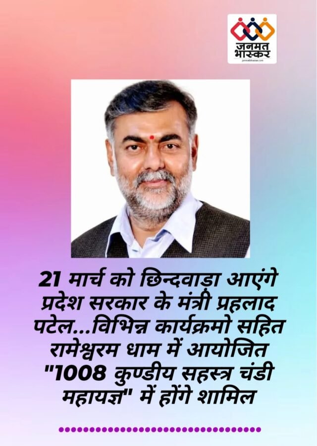 जनमत भास्कर,छिन्दवाड़ा:-प्रदेश के पंचायत एवं ग्रामीण विकास तथा श्रम विभाग के मंत्री प्रहलाद सिंह पटेल 21 मार्च को छिंदवाड़ा जिले के दौरे पर रहेंगे।निर्धारित कार्यक्रम के अनुसार मंत्री श्री पटेल दोपहर 2 बजे कुण्डीपुरा थाना के पास,जनपद पंचायत छिंदवाड़ा पहुंचेंगे,जहां वे “अटल सुशासन भवन (जनपद पंचायत भवन) छिंदवाड़ा” का भूमि पूजन करेंगे।इसके बाद वे शाम 4 बजे जनपद पंचायत बिछुआ पहुंचेंगे,जहां वार्ड क्रमांक-12, सामुदायिक स्वास्थ्य केंद्र के पास “अटल सुशासन भवन (जनपद पंचायत भवन) बिछुआ” का भूमि पूजन करेंगे।