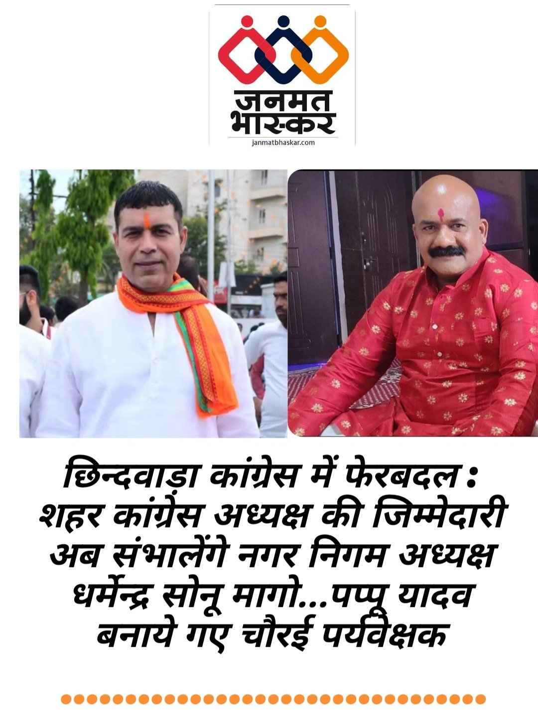 जनमत भास्कर,छिन्दवाड़ा:- मप्र के पूर्व मुख्यमंत्री कमलनाथ एवं जिले के पूर्व सांसद नकुलनाथ के निर्देशानुसार शहर कांग्रेस अध्यक्ष एवं चौरई पर्यवेक्षक पद पर नवनियुक्ति की गई है। नवनियुक्त पदाधिकारियों को तत्काल प्रभाव से जिम्मेदारी सौंपकर जिम्मेदारी संभालने हेतु निर्देशित किया गया है।