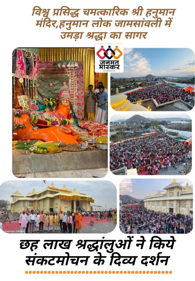 जनमत भास्कर पांढुर्णा/छिन्दवाड़ा :- हनुमान जन्मोत्सव के पावन अवसर पर जामसांवली स्थित विश्व प्रसिद्ध चमत्कारिक श्री हनुमान मंदिर,हनुमान लोक में आस्था का ऐसा महाकुंभ साकार हुआ,जिसने भक्ति, विश्वास और सेवा की एक अद्भुत मिसाल प्रस्तुत की। आयोजन के अंतिम दिन श्रद्धालुओं का जनसैलाब इस तरह उमड़ा कि पूरा क्षेत्र ‘जय श्रीराम’ और ‘जय हनुमान’ के जयघोष से गूंज उठा।लगभग छह लाख श्रद्धालुओं ने संकटमोचन के चरणों में शीश नवाकर अपनी श्रद्धा अर्पित की।यह दृश्य केवल एक धार्मिक आयोजन नहीं बल्कि सामाजिक एकता,समर्पण और सेवा का जीवंत उदाहरण बन गया।हर आने वाले भक्त के लिए यह अनुभव दिव्यता और आस्था से परिपूर्ण, जीवनभर याद रहने वाला क्षण बन गया।