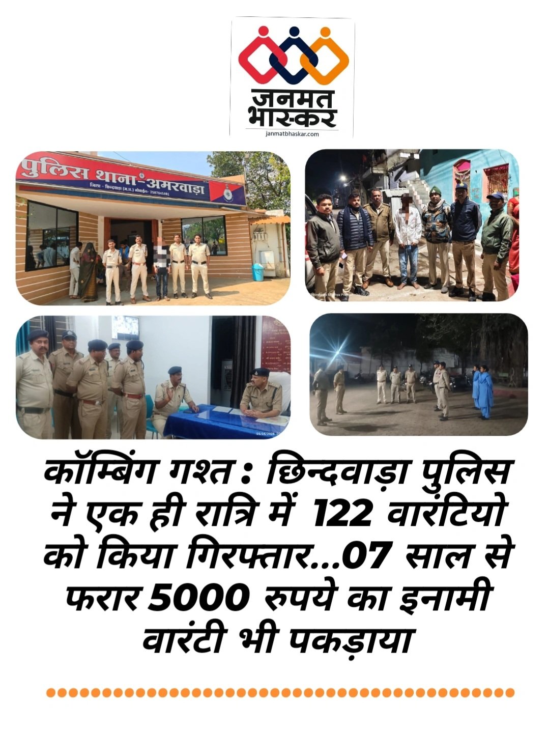 जनमत भास्कर,छिन्दवाड़ा:-प्रदेश स्तरीय रात्रि काम्बिंग गश्त के संबंध में पुलिस मुख्यालय भोपाल द्वारा दिये गये निर्देशानुसार जिले में अवैध गतिविधियों में लिप्त व्यक्तियो की निरंतर धरपकड़ व अवैध कार्यो में संलिप्त व्यक्तियों,अपराधियों तथा अपराधों पर अंकुश लगाने व जिले में कानून व्यवस्था बनाये रखने व आदतन अपराधियों पर शिकंजा कसने के उद्देश्य से पुलिस अधीक्षक छिंदवाड़ा द्वारा विशेष ऑपरेशन चलाकर बीती रात्रि में शहर व देहात के थाना क्षेत्रो पर कॉम्बिंग ऑपरेशन के दौरान कॉम्बिंग गस्त अनुभागवार पुलिस बल को अलग-अलग स्थानो पर एकत्रित किया जाकर राजपत्रित अधिकारियों द्वारा पुलिस बल को ब्रीफ किया गया उसके बाद अलग-अलग क्षेत्रो में कॉम्बिंग गस्त के लिये रवाना किया गया।पुलिस टीम द्वारा स्थायी/गिरफ्तारी वारंटियो की धरपकड़ हेतु प्रत्येक थाने में अलग-अलग पुलिस टीम तैयार कर वारंटियो की गिरफ्तारी हेतु मुखबिर तंत्र सक्रिय कर तकनीकी शाखा (सायबर सेल) के सहयोग एवं नाकाबंदी/दबिश देकर एक ही रात्रि में औचक नाईट काम्बिंग ऑपरेशन चलाकर 23 स्थायी व 99 गिरफ्तारी इस प्रकार कुल 122 वारंटियो को दबिश/घेराबंदी/नाकाबंदी कर गिरफ्तार किया गया,सभी गिरफ्तारशुदा वारंटियों को न्यायालय के समक्ष पेश किया गया।