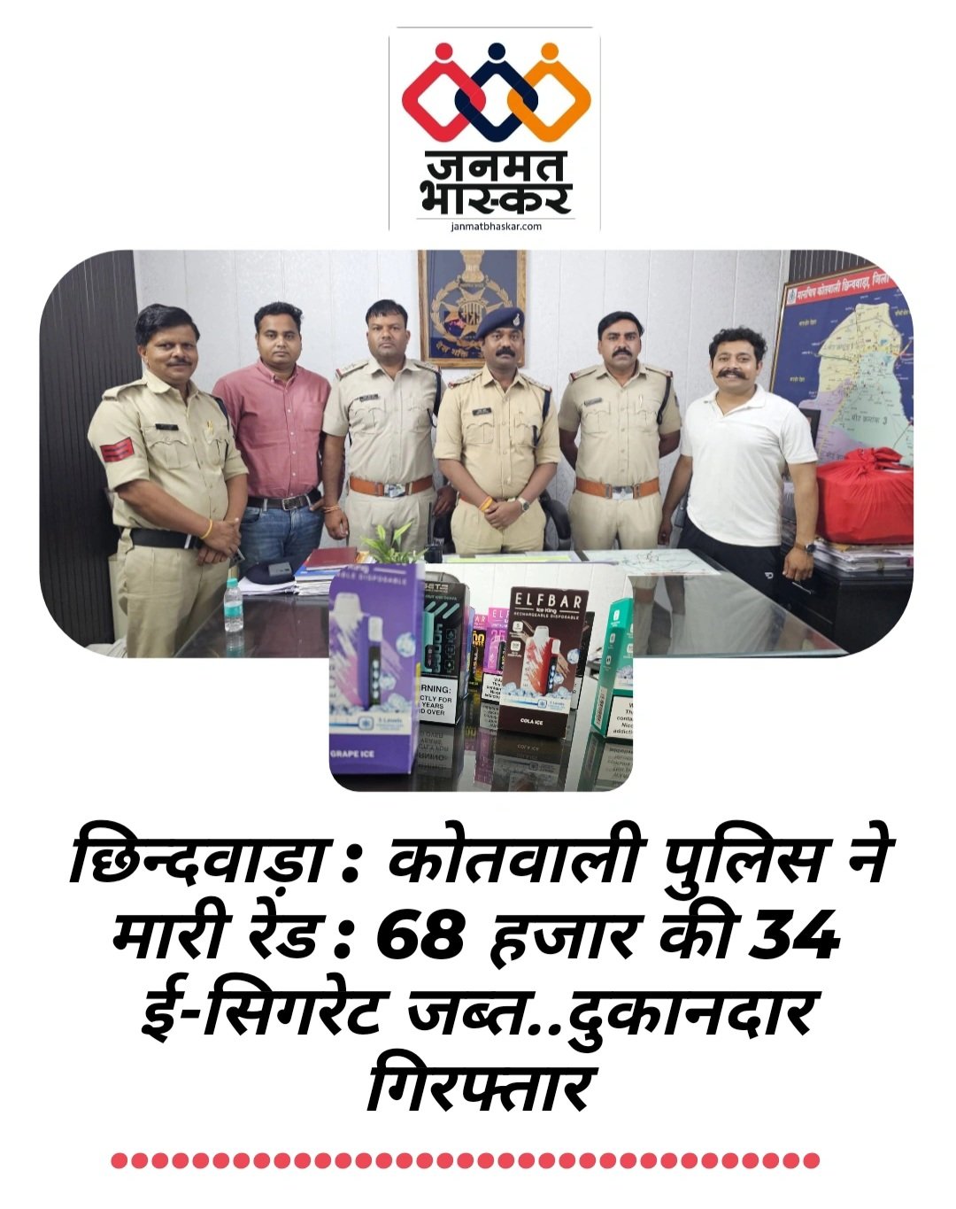 जनमत भास्कर,छिन्दवाड़ा:-शहर के बस स्टैंड स्थित एक दुकान में शनिवार को कोतवाली पुलिस ने छापामार कार्रवाई की। तलाशी के दौरान दुकान से प्रतिबंधित इलेक्ट्रिक वेब सिगरेट जब्त की गई है।34 इलेक्ट्रिक वेब सिगरेट की कीमत 68 हजार रुपए बताई जा रही है।पुलिस ने दुकानदार को गिरफ्तार कर अपराध दर्ज किया है।