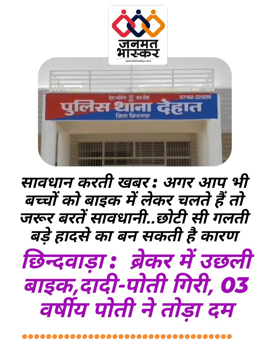 अब इस घटना का कारण ओवर स्पीड,लापरवाही, असंतुलन या ब्रेकर है… यह तो जांच के बाद ही पता चलेगा लेकिन सत्यता तो यह है कि एक परिवार ने असमय एक मासूम को खो दिया इसीलिए आप सभी इस खबर से सबक लेते हुए बाइक में अगर बच्चों को बैठाल कर सफर कर रहे हैं तो आपको अति सावधानी बरतने की आवश्यकता है।