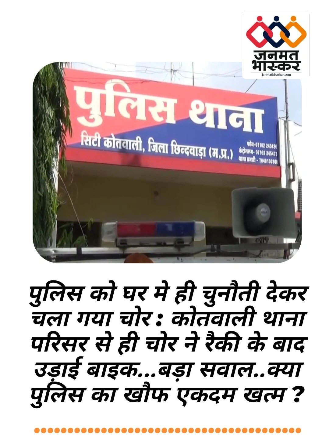 जनमत भास्कर,छिंदवाड़ा:- चोर – बदमाशों के हौसले कितने बुलंद हैं और पुलिस का खौफ कितना है,इसका बड़ा नमूना सामने आया है। घरों,दुकानों और मंदिरों में चोरियों के बाद अब बदमाश कोतवाली थाना में भी सेंध लगा गए हैं।कोतवाली थाना परिसर से चोरों ने बाइक चुरा ली है।चोरी गई बाइक अधिवक्ता की है।अधिवक्ता परिसर में बाइक खड़ी कर थाने के भीतर एक पीएम रिपोर्ट लेने गए थे।वे भीतर गए और इधर चोरों ने कमाल दिखा दिया।चोरी की वारदातों में घिरी कोतवाली पुलिस अब अपने घर की सुरक्षा भी नहीं कर पा रही है।जिससे शहर में पुलिसिंग को लेकर बड़े सवाल खड़े हो रहे हैं।