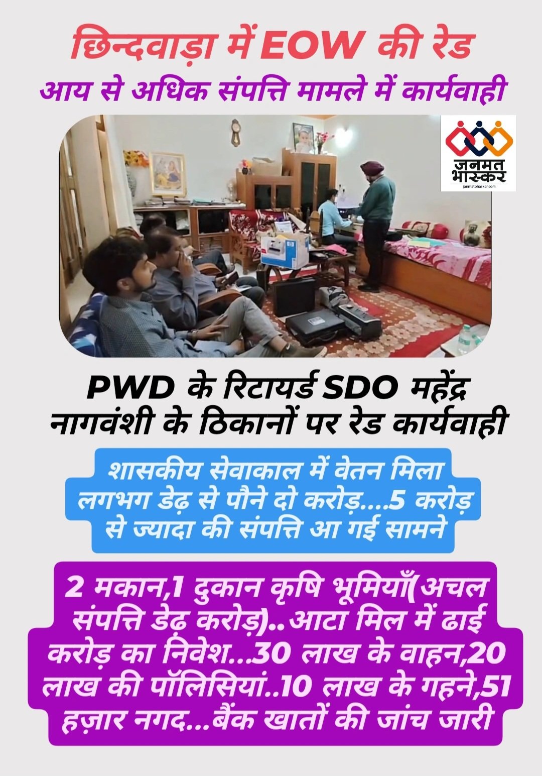 जनमत भास्कर,छिन्दवाड़ा:-गुरुवार अलसुबह ईओडब्ल्यू जबलपुर की 25 सदस्यीय टीम ने डीएसपी मंजीत सिंह के निर्देशन में छिन्दवाड़ा के परासिया रोड स्थित पीडब्ल्यूडी विभाग के रिटायर्ड एसडीओ महेंद्र नागवंशी के निवास और गुरैया रोड स्थित आटा मिल में दबिश दी…गुरुवार अलसुबह से जारी इस कार्यवाही के दौरान ईओडब्ल्यू की टीम को अभी तक रिटायर्ड एसडीओ महेंद्र नागवंशी के पास शासकीय सेवाकाल में होने वाली आय से 200 प्रतिशत से भी अधिक आय अर्जित करने के साक्ष्य मिले हैं फिलहाल छिन्दवाड़ा में रिटायर्ड एसडीओ महेंद्र नागवंशी के ठिकानों पर ईओडब्ल्यू की कार्यवाही अभी भी जारी है जिसमे और भी आय से अधिक संपत्ति सामने आ सकती है।