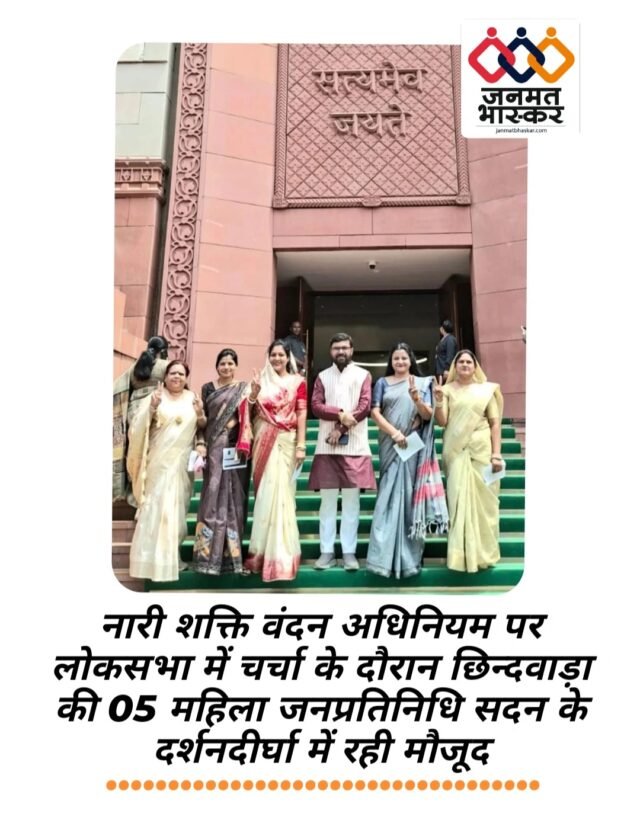 जनमत भास्कर,छिन्दवाड़ा:-नारी शक्ति वंदन अधिनियम (128वां संविधान संशोधन विधेयक 2023) पर लोकसभा में चर्चा के दौरान छिंदवाड़ा जिले की 5 महिला जनप्रतिनिधि नारी शक्ति वंदन अधिनियम विधेयक की साक्षी बनी।पांचों महिला जनप्रतिनिधि लोकसभा के विशेष सत्र के दौरान सदन के दर्शनदीर्घा में मौजूद रही।
